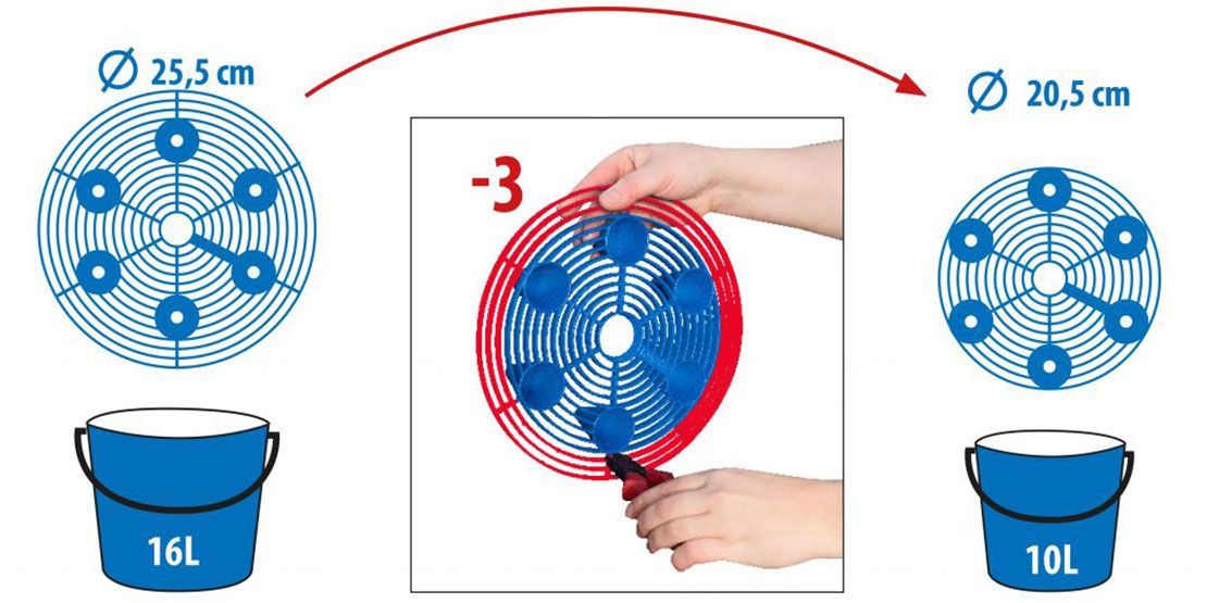 - Takođe ga možete prilagoditi kofama od 10-litara ukoliko odsečete tri periferna prstena kleštima.
